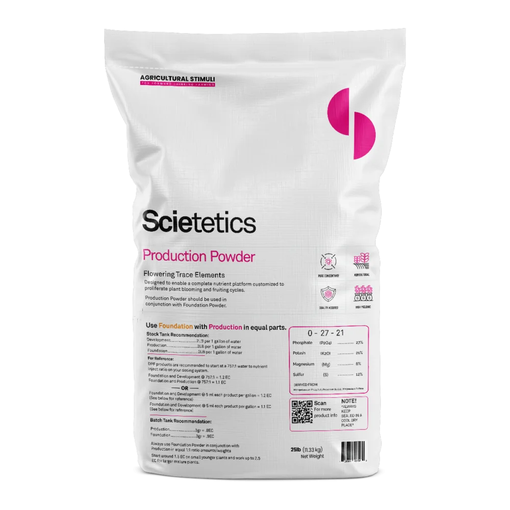 Production Powder Production Powder contains a concentrated blend of primary and trace minerals specifically formulated to promote robust flowering and fruit development. The product is designed to be used in conjunction with Scietetics Foundation at a 1:1 ratio to achieve optimal nutrient balance and electrical conductivity (EC) levels MORE INFORMATION Key Benefits Enhanced Blooming: The powder’s nutrient profile is tailored to support vigorous flower production. Improved Fruit Development: Concentrated micronutrients contribute to high-quality yields and fruit formation. Flexible Application: Suitable for both hydroponic systems and soil-based cultivation